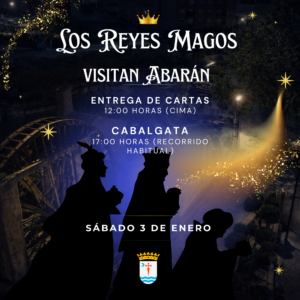 Sus Majestades los Reyes Magos de Oriente informan a todas las familias y niños/as del municipio de Abarán que, debido a las previsiones de lluvia para los próximos días, se ha decidido adelantar la cabalgata y la entrega de cartas a mañana sábado, 3 de enero de 2026.
